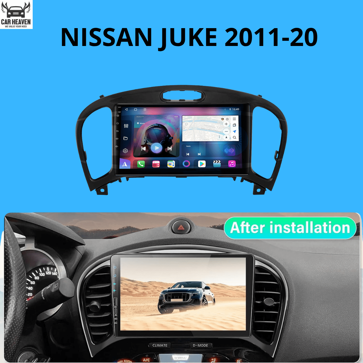 The perfect touchscreen upgrade for your 2011–2020 Nissan Juke! This 9-inch Android 13 unit comes with the exact black OEM-style curved fascia (matches factory vents & button layout perfectly). Wireless + wired Apple CarPlay & Android Auto, vibrant QLED 1280×720 screen, 4GB+64GB, Bluetooth 5.0, GPS, Netflix/YouTube. 100% plug & play – retains steering wheel controls, zero gaps, no cutting, no errors. Finally, a head unit that looks factory-fresh while giving your Juke full 2025 connectivity!